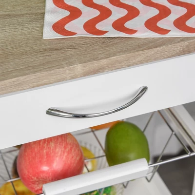 - MULTIPLE STORAGE OPTIONS: This kitchen island features a storage drawer for small kitchen accessories and utensils, a slide-out wire storage basket, 2 pull out trays, and a fixed shelf. Each storage tray can be used as an independent serving tray.