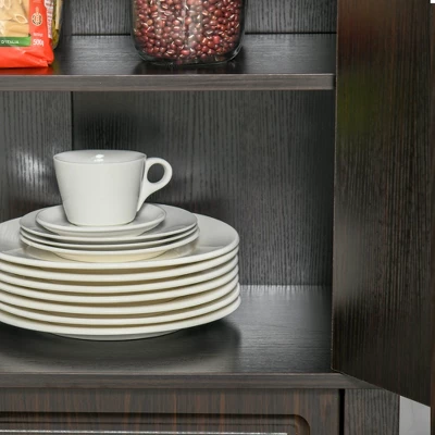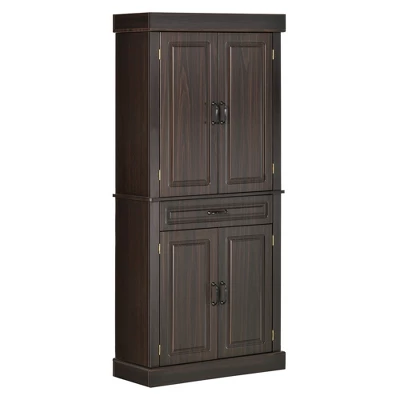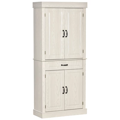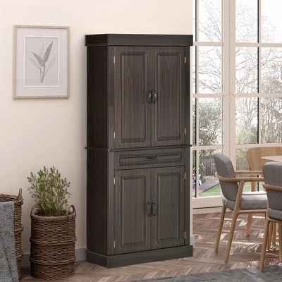 Create more storage space while adding style with this HOMCOM pantry cabinet. Featuring a wood grain veneer, raised door panels, and antiqued metal hardware, it has charm and elegance, which will match your kitchen, dining room, or living room. Equipped with two cabinets and a drawer, this storage organizer gives you space to place your plates or utensils. With its compact design and excellent storage capabilities, this cabinet organizer will become your new favorite piece of furniture.