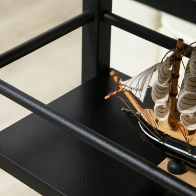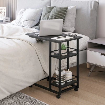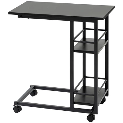 HOMCOM C Shaped End Table With Storage Shelves, Mobile Side Table With Wheels For Sofa Couch, Bed, Metal Frame, Black
