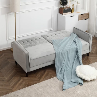 HOMCOM Convertible Sleeper Sofa, Futon Sofa Bed With Split Back Design Recline, Thick Padded Velvet-Touch Cushion Seating And Wood Legs, Light Grey