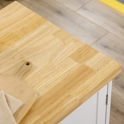 - Additional Chopping Board: Need more elbow room or counter space for food preparation? This rolling kitchen island will do the job. With a rubberwood butcher block cutting surface, you have a sturdy workspace that can be wiped down easily when the cooking is done.